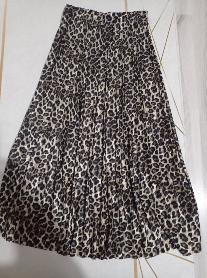 Sentetik kumaştan yapılmış, kahverengi leopar desenli uzun pileli etek. Beli lastikli 1 kez kullanıldı temiz defosuzdur. 40-42-44 beden uyumlu.