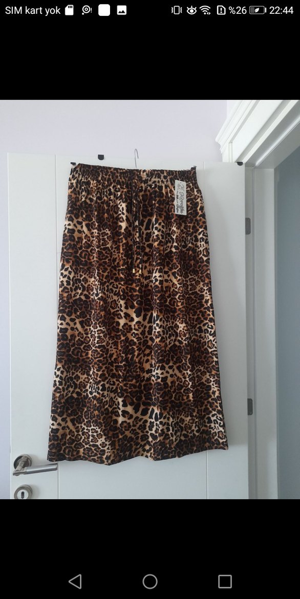 Koyu kahverengi leopar desenli, pilili uzun etek. Rahat kesimli ve yumuşak sentetik kumaştan, günlük sokak stiline uygun, bohem ve rahat bir görünüm sunar.
