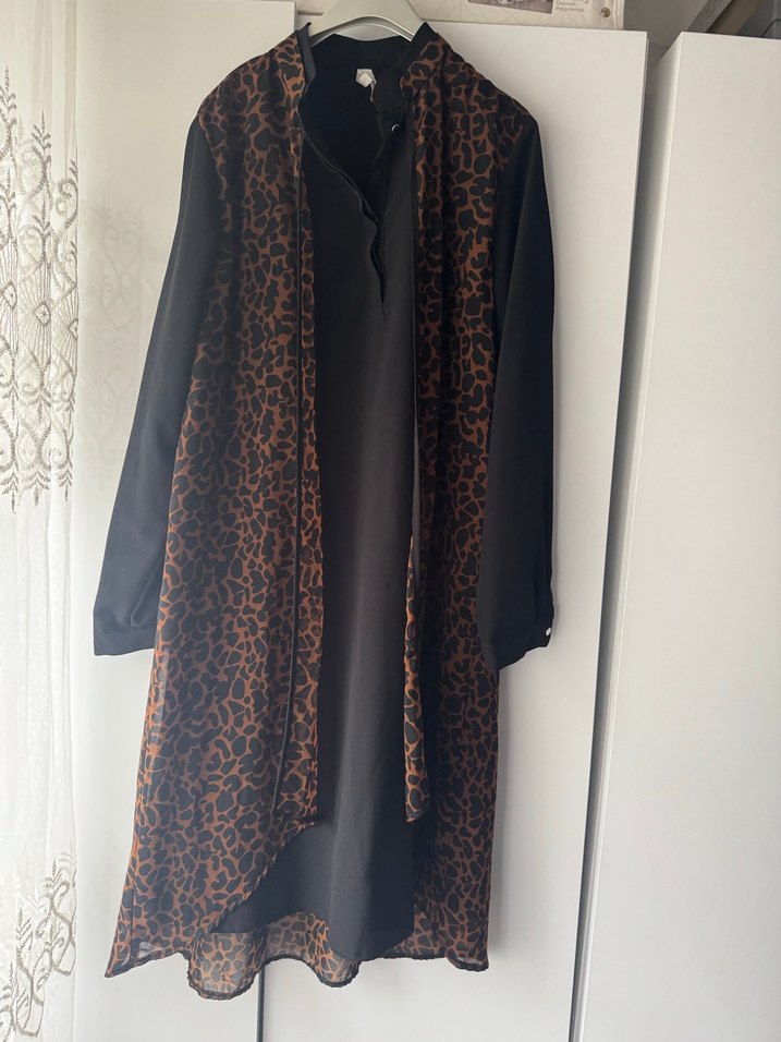 Uzun, salaş kesim tunik, leopar desenli drapeli tasarıma, uzun kollu ve kesik yakaya sahip, koyu kahverengi sentetik kumaştan üretilmiştir.