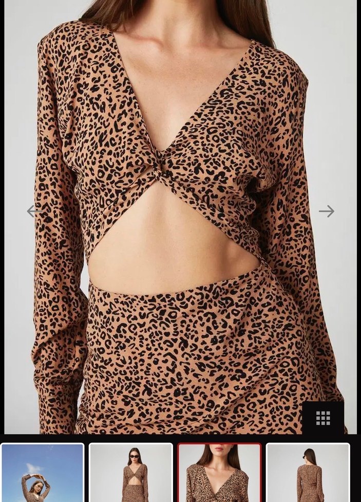 V yaka, uzun kollu, dar kesim mini bluz. Koyu kahverengi leopar desenli ve drapeli, cesur sokak stili için uygun.