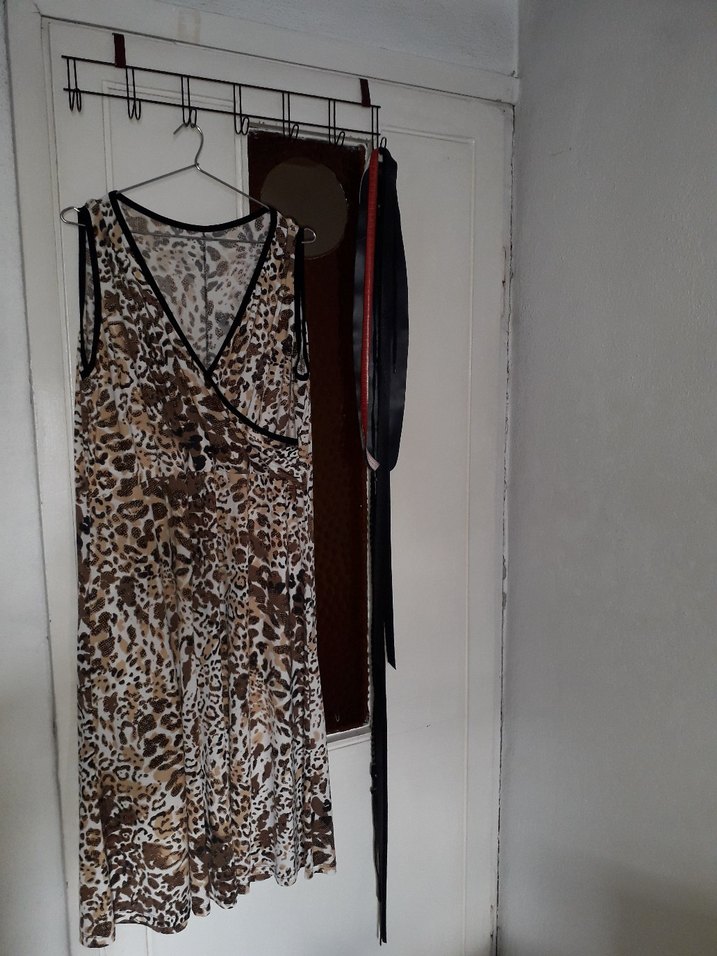 Leopar desenli, V yaka, drapeli, bol kesim elbise, yumuşak sentetik kumaştan, günlük kullanım için uygundur.Yeni gibi sayılır dolapta durdu