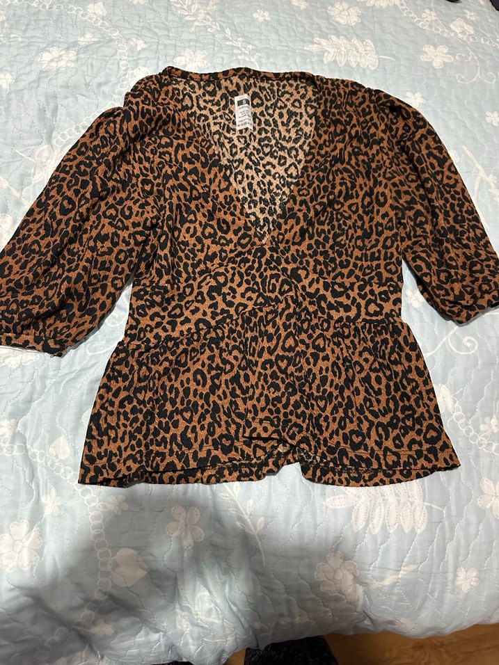 Kadınlar için bol kesim, uzun kollu ve V yakalı bu bluz, koyu kahverengi leopar desenli ve fırfır detaylıdır. Yumuşak sentetik kumaştan üretilmiştir, günlük sokak stiline uygundur. S beden esnek sıfır kullanılmadı