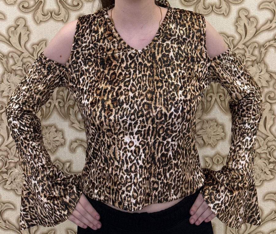 V yaka ve uzun kollu, kürklü detaylı, leopar desenli fitted kadın bluz. Yumuşak sentetik kumaştan, koyu kahverengi tonlarında, partiler için uygun.