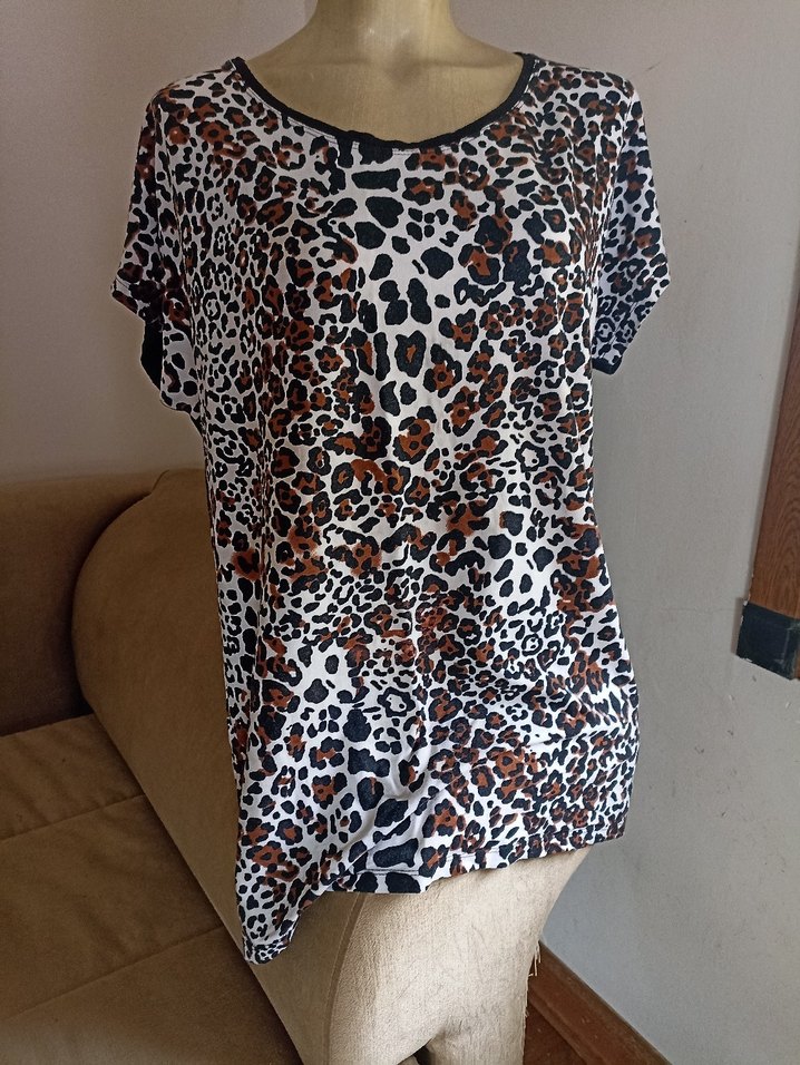 Kısa kollu, V yaka ve dökümlü tasarıma sahip, koyu kahverengi leopar desenli, bol kesim kadın bluz. Günlük kullanıma uygundur. M - L beden