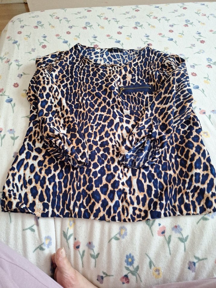 Kadın bluz, rahat kesim, uzun kollu ve V yakalıdır. Koyu kahverengi leopar desenli, düğmeli ve sentetik kumaştan üretilmiştir.