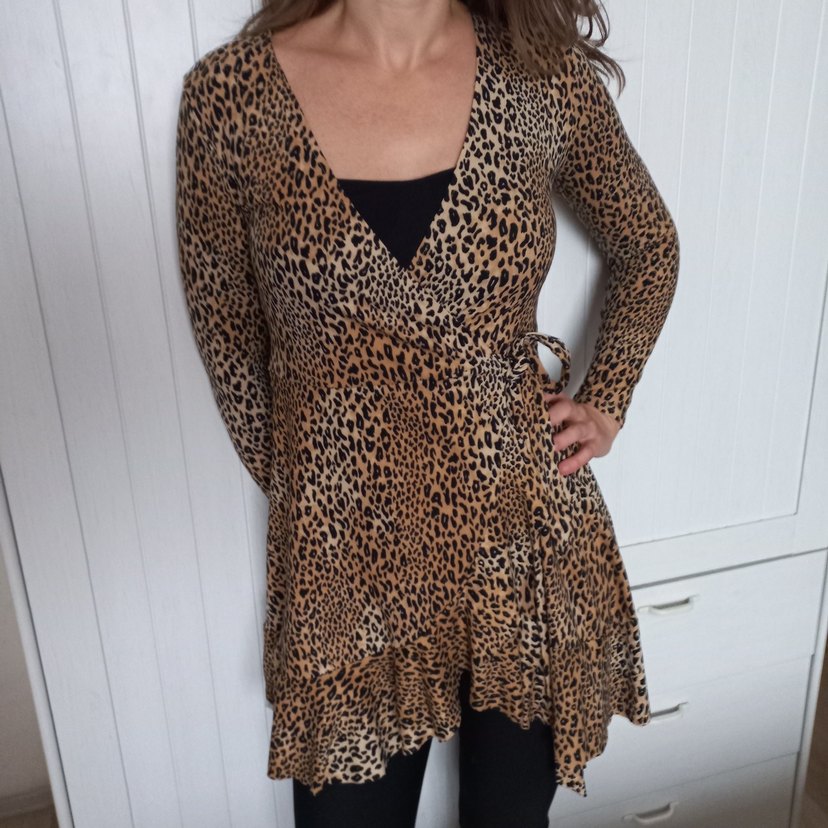Kahverengi leopar desenli mini elbise, V yaka ve uzun kollu, kuşaklı ve vücuda oturan kesime sahiptir. Yumuşak peluş kumaştan üretilmiştir, günlük kullanım için uygundur. Tunik olarak ta kullanılabilir