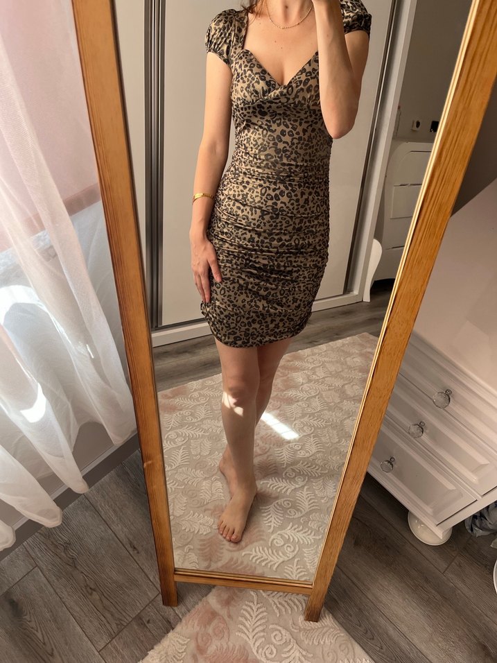 Leopar Desenli V Yaka Midi Elbise