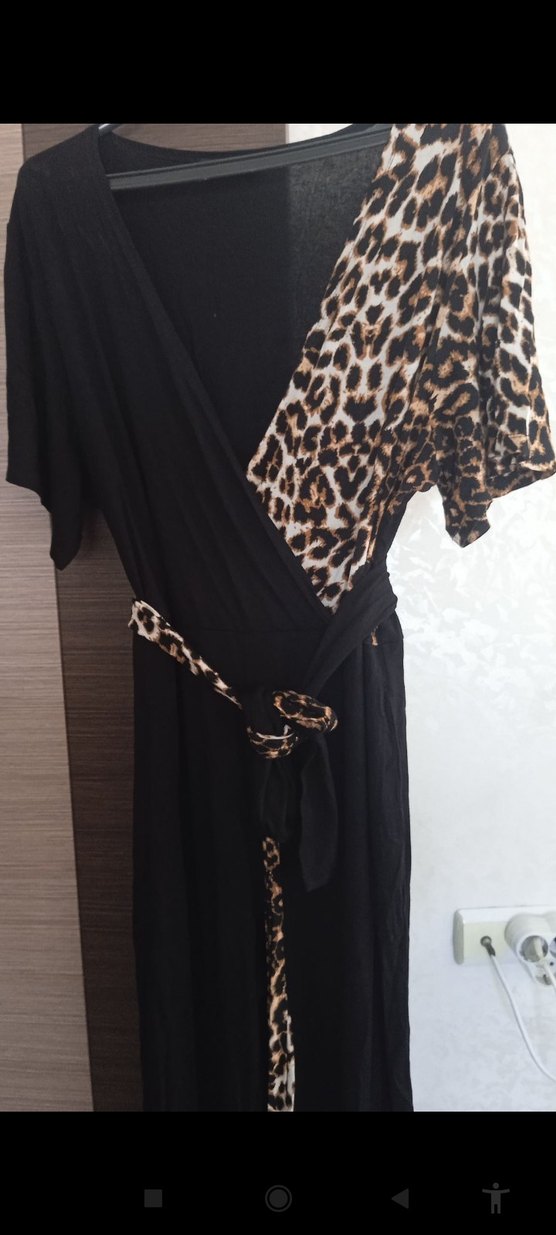 Leopar desenli, V yakalı ve kuşaklı uzun siyah salopet, rahat kesimiyle sokak stiline uygun.
