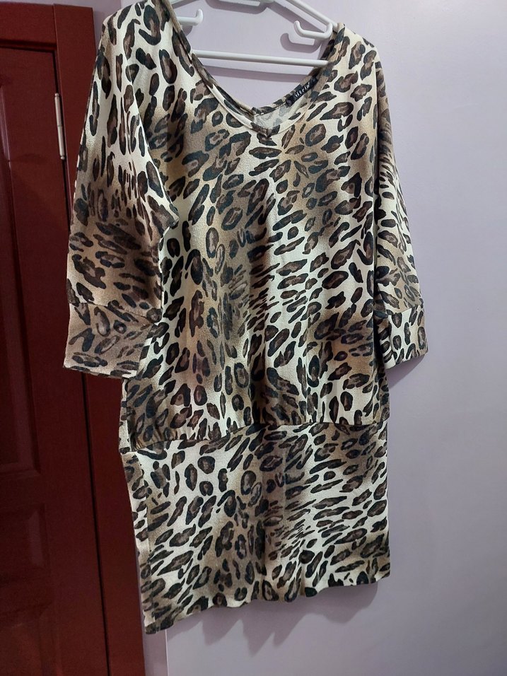 Yumuşak yün kumaştan, leopar desenli, V yakalı, uzun kollu, salaş kesim midi boy tunik. Drapeli tasarımıyla rahat ve şık bir seçenek.