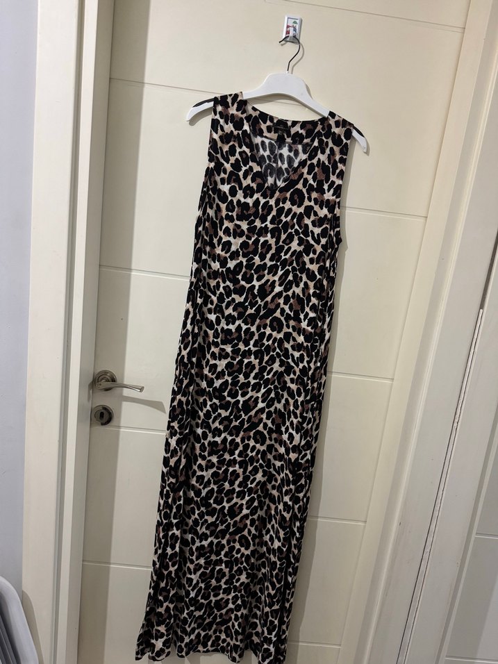 Kolsuz, bol kesim ve drapeli tasarıma sahip, sentetik kumaştan yapılmış, koyu kahverengi leopar desenli uzun elbise.
