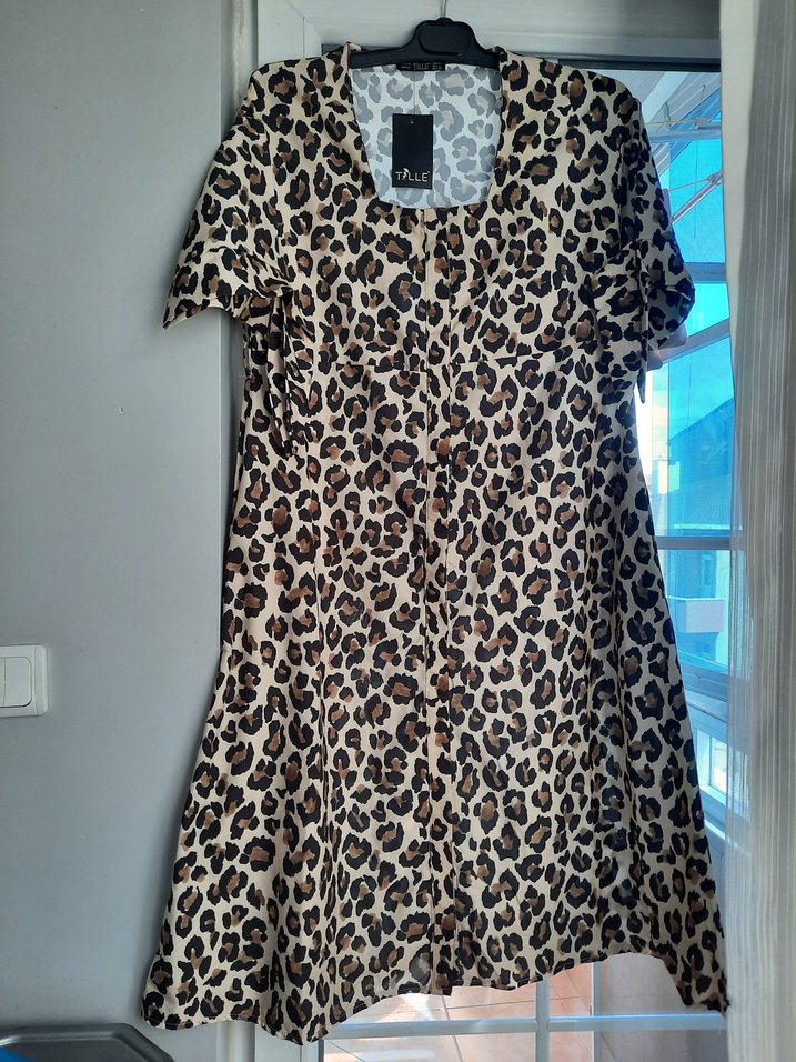 Kahverengi leopar desenli, kısa kollu, kare yakalı, düğmeli, midi boy rahat kesim elbise.etiketli ürün hediye almıştım olmadı bedeni.bel-boy ölçüleri görselde eklidir