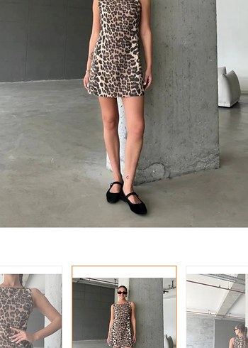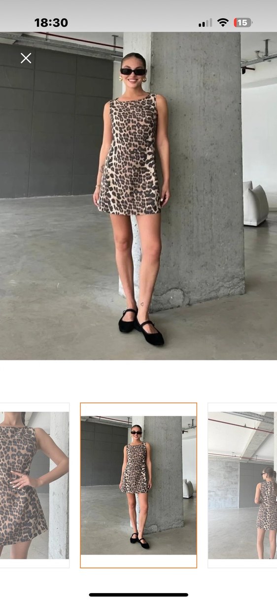 Koyu kahverengi leopar desenli, V yakalı ve ince askılı, sentetik kumaştan yapılmış, rahat ve şık mini elbise.