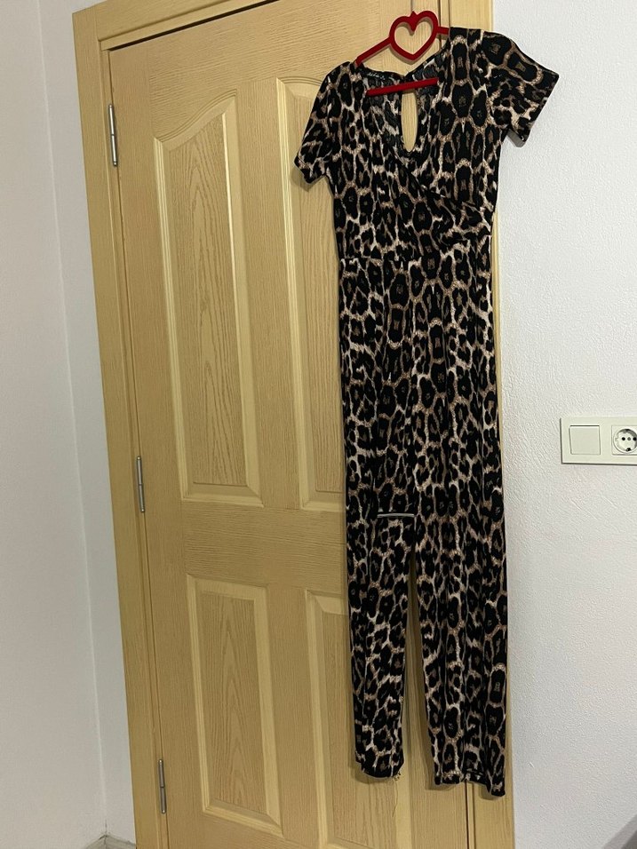 Koyu kahverengi leopar desenli, v yakalı ve kısa kollu,dar kesim tulum. Günlük sokak stili için uygundur.