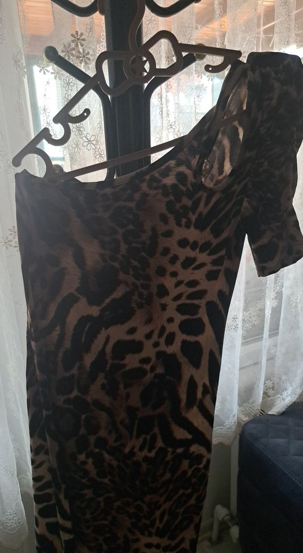 Drapeli, fit kesim tunik, satenimsi kumaş ve askılı kol detayına sahiptir. V yakalı, midi boyunda, koyu kahverengi leopar desenlidir.