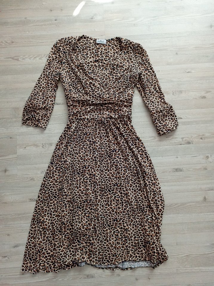 Drapeli, V yakalı ve ince askılı, fitted kesim uzun elbise. Koyu kahverengi leopar desenli, sentetik kumaştan, bohem tarzda.