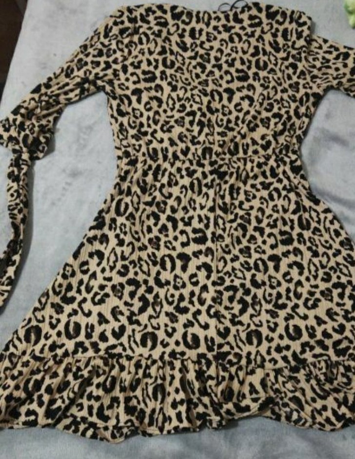Yarım kollu, V yakalı ve midi boy, leopar desenli, yumuşak sentetik kumaştan yapılmış, etek kısmında fırfır detaylı dar kesim elbise.