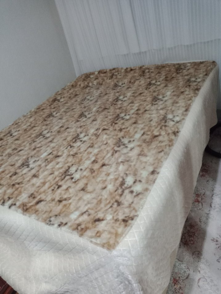 Açık kahverengi batik desenli yatak örtüsü, yumuşak ve doğal bir görünüm sunar. Dokusu pürüzsüz ve konforludur. ️