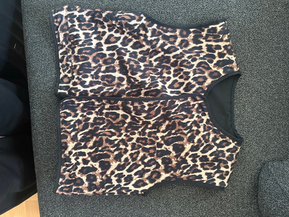 V yaka, kolsuz yelek koyu kahverengi leopar desenlidir ve sentetik kumaştan üretilmiştir.