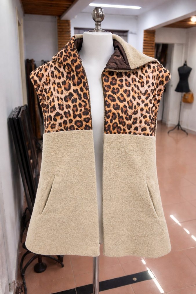Kolsuz, yüksek yakalı ve fitted kesimli kadın yelek, yumuşak sıcak kumaş ve leopar desenli kürk detaylarıyla trend ve rahat bir stil sunar.