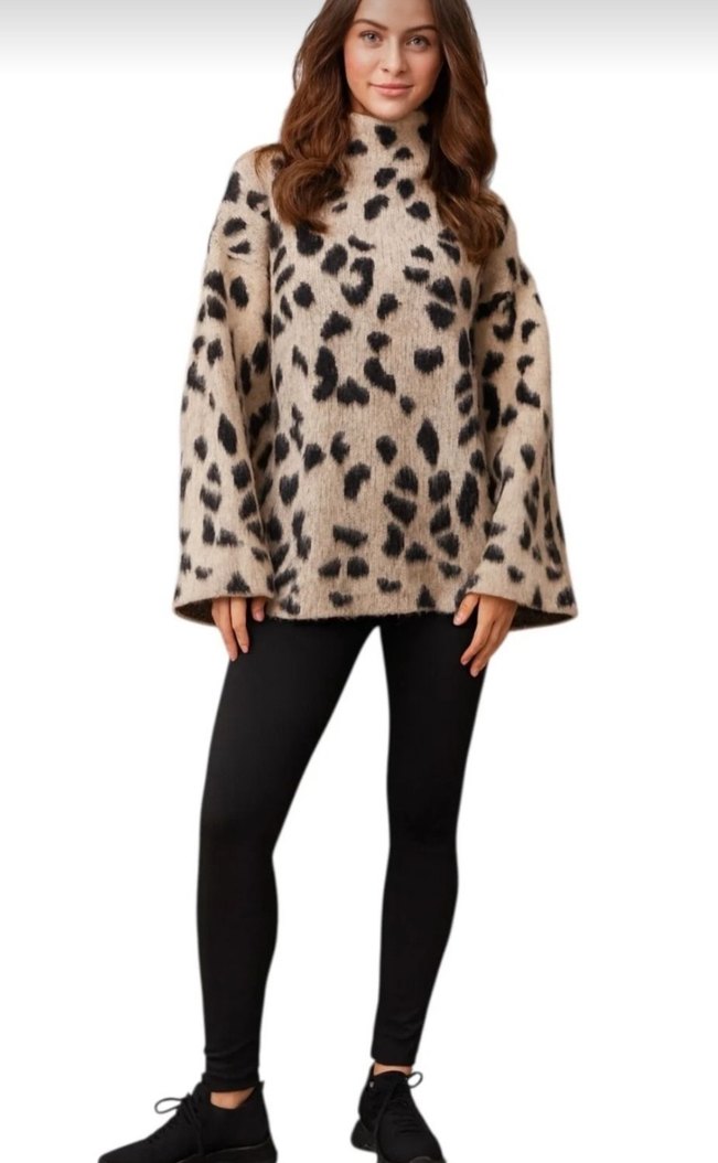 Uzun kollu, boğazlı ve leopar desenli yumuşak kumaştan, kahverengi kazak