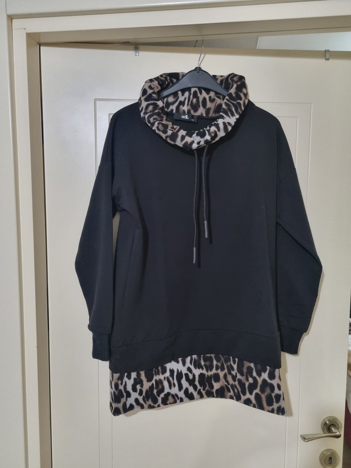 Adl marka kısa xs beden sweat elbise. Kumaşı pamuklu, alt kısmı ve boyun kısmı leopar tül gibi kumaştandır. Hem şık hem spor kombine uygun tek parçadır.