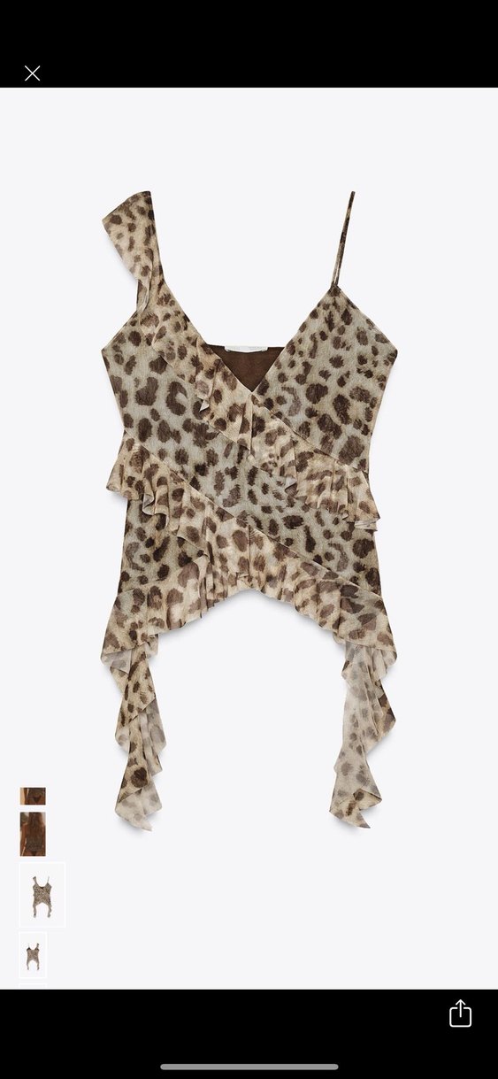 Kadınlar için leopar desenli, V yakalı ve askılı, fırfır detaylı, bohem tarzda, kısa kesim ve dar kesim bluz. Parti için uygundur.