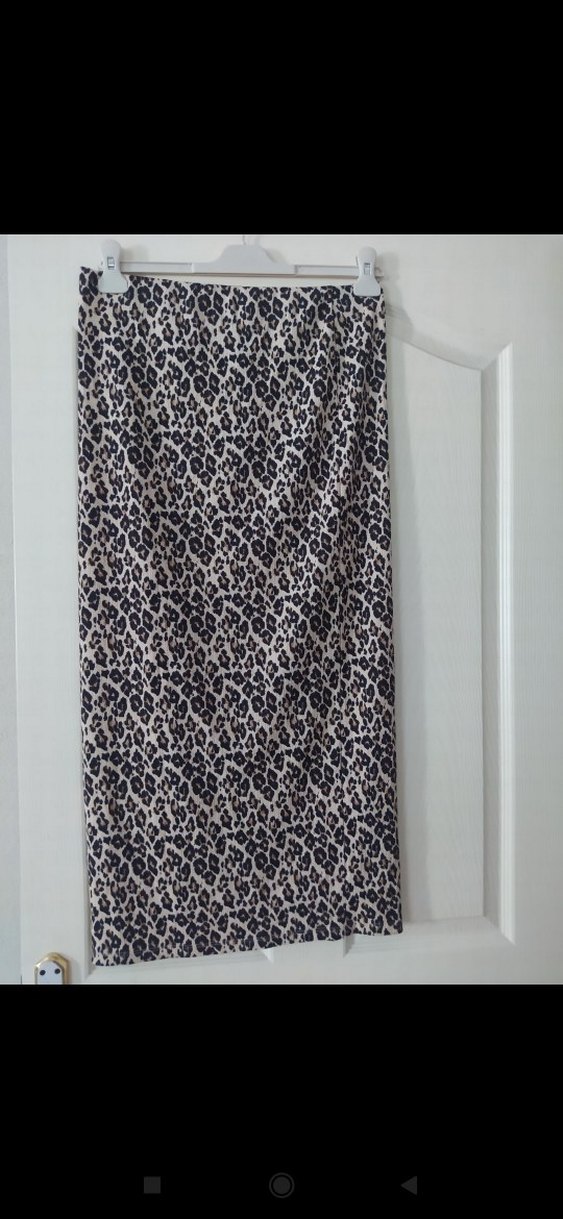 Leopar desenli, uzun ve bedenine oturan bu etek,yandan yırtmaçlı tasarımıyla dikkat çeker. Pürüzsüz sentetik kumaştan yapılmıştır ve günlük sokak stili için uygundur.