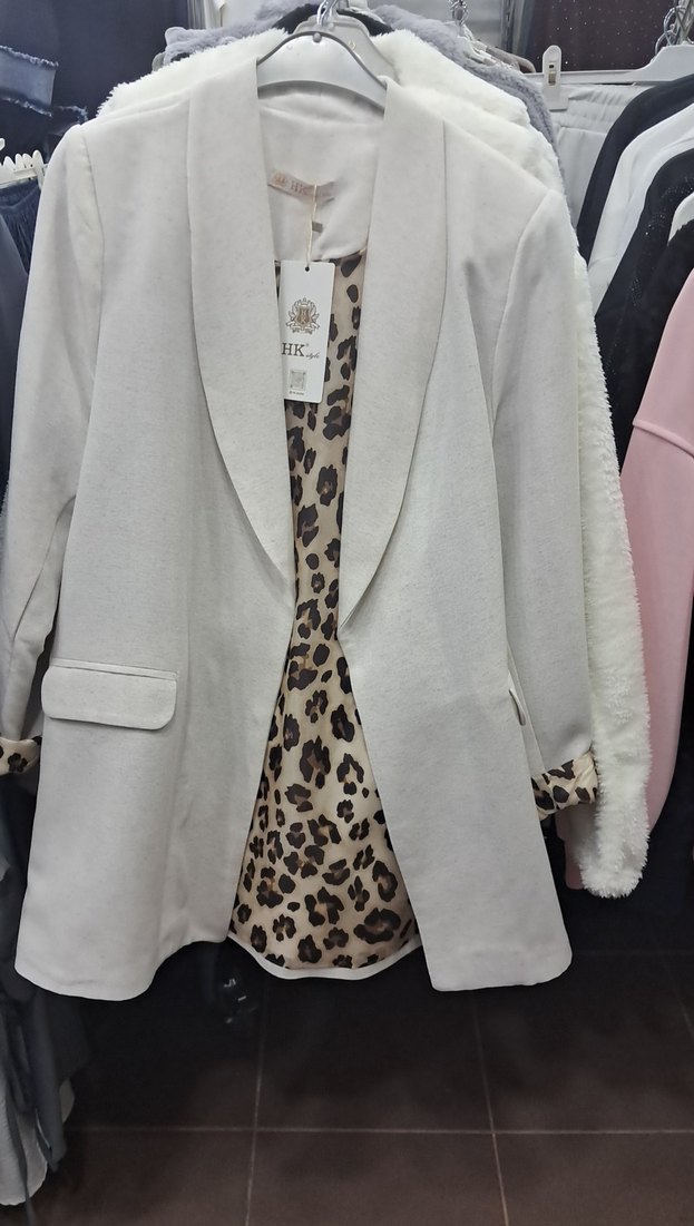 Notch yaka, uzun kollu beyaz kısa blazer. Leopar desenli kürk detaylarıyla trend bir dokunuş sağlar. Ofis için uygun, rahat kesim ve yumuşak sentetik kumaş.