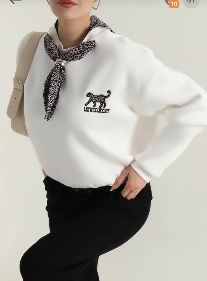 Fularlı sweatshirt beyaz kadın sweatshirt, yuvarlak yaka, uzun kollu ve bol kesimdir. Yumuşak ve sıcak kumaş üzerine leopar kürk detayları içerir. Rahat sokak stili için uygundur.