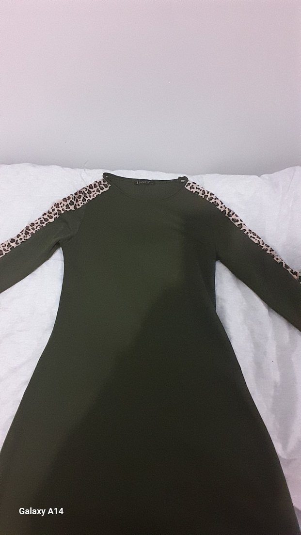 Fitted kesim haki triko elbise, yuvarlak yaka ve uzun kollu. Omuzlarda yılan desenli zincir detayları bulunur, sokak stiline uygun.