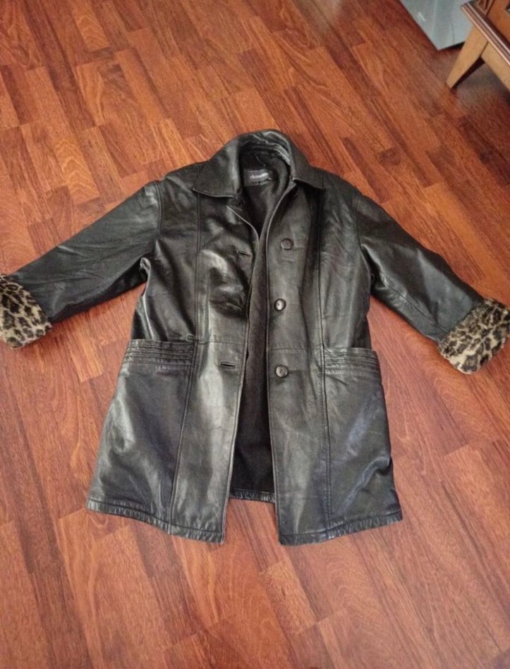 Uzun vintage deri ceket, bol kesim ve uzun kolludur. Manşetlerde leopar kürk detayları bulunur. Notch yakalı, goth ve grunge punk tarzına uygundur.