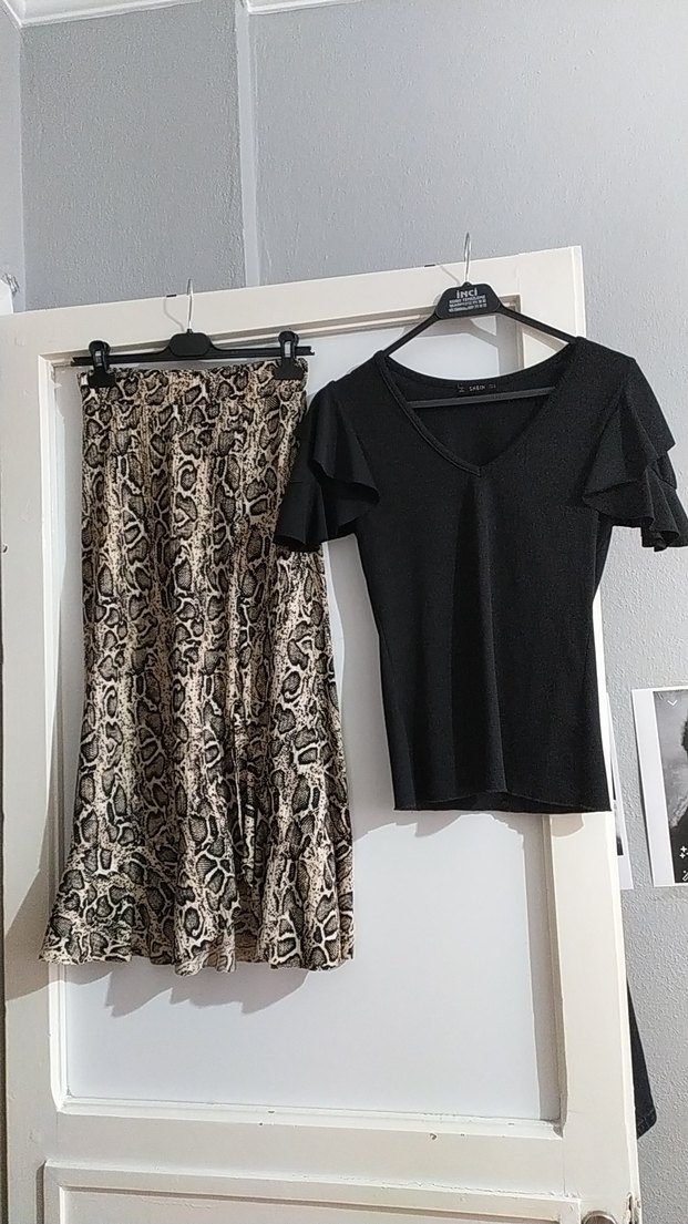 leopar etek yanında siyah uyumlu bluz bir defa giyildi etek ligralı m beden bluz ligralı
