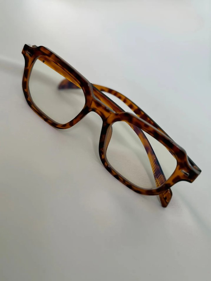 Kahverengi transparan ve renkli çerçeveli kadın gözlüğü, çağdaş tasarımıyla klasik ve hafif eski tarz bir görünüm sunar. leopar desenli gözlük