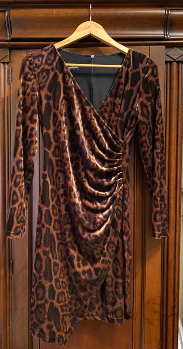 Leopar desenli ,belinde drape detayı, V yakalı, uzun kollu, kadife kumaştan yapılmış, vücuda oturan şık bir elbise. Romantik bir akşam için uygun. Beden 38-40 Boy 92 Göğüs 96 Basen 100
