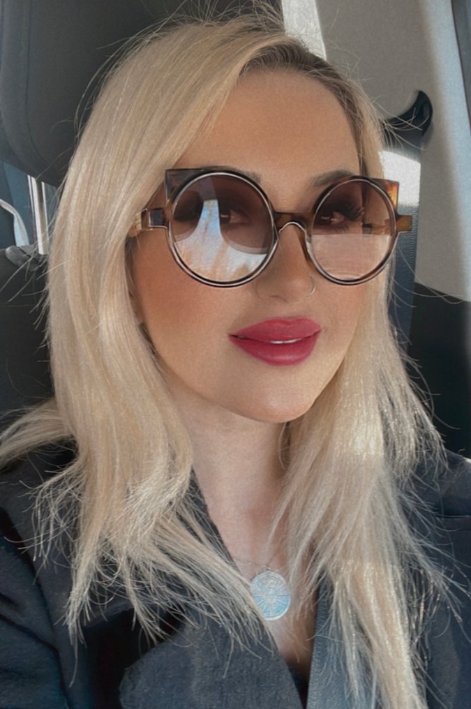 Klasik tarzda, parlak bej renkte yuvarlak kadın güneş gözlüğü. Cesur sokak modasına uygun, parlak yüzeye sahip.