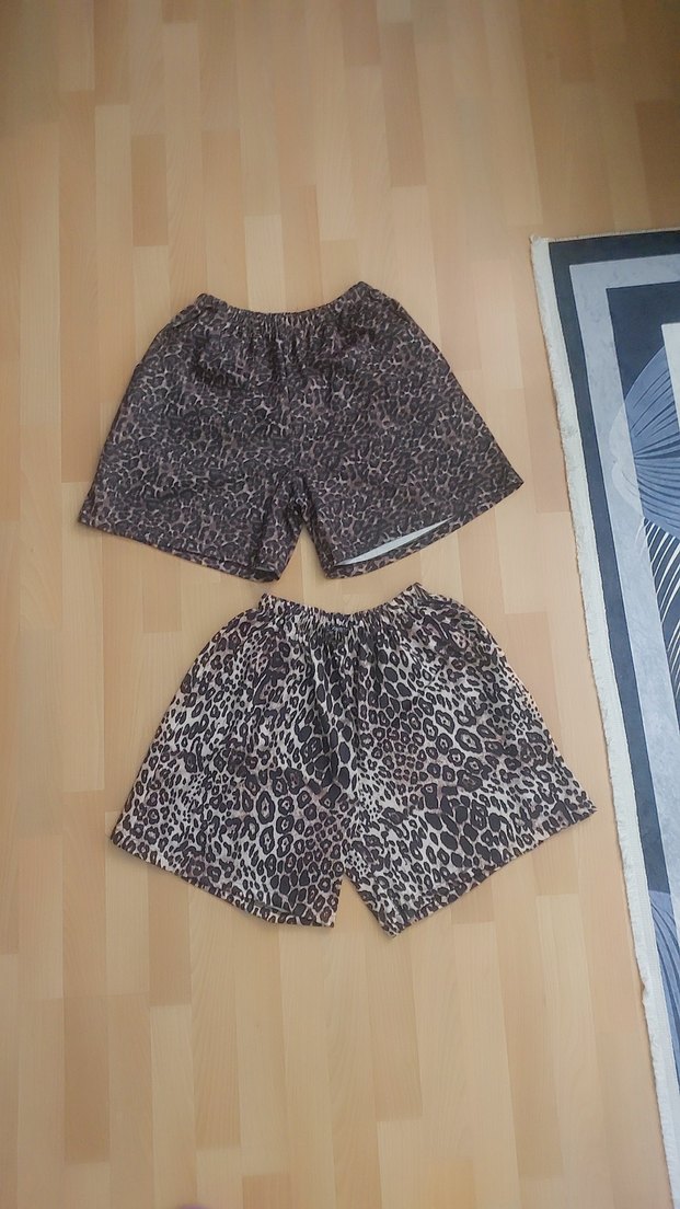 Yumuşak kumaştan, koyu kahverengi leopar desenli bol kesim şortlar, günlük rahatlık için ideal. ikisi 290tl. tek-tek 150tl