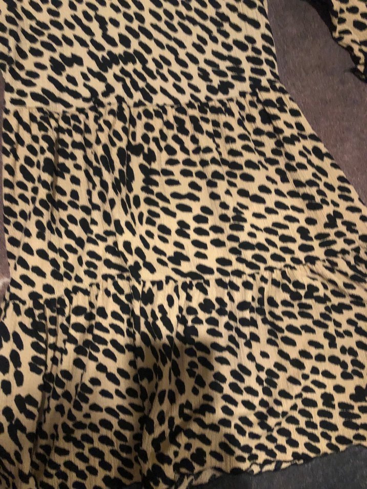Kahverengi zebra desenli midi , bol kesim ve fırfır detaylarına sahip, günlük sokak stili için uygundur.