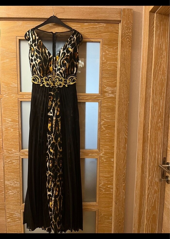 Sadece 1 defa giyilmiş, leoparlı önü işli elbise. Gece elbisesi olarak kullanılır. Bedeni L/40