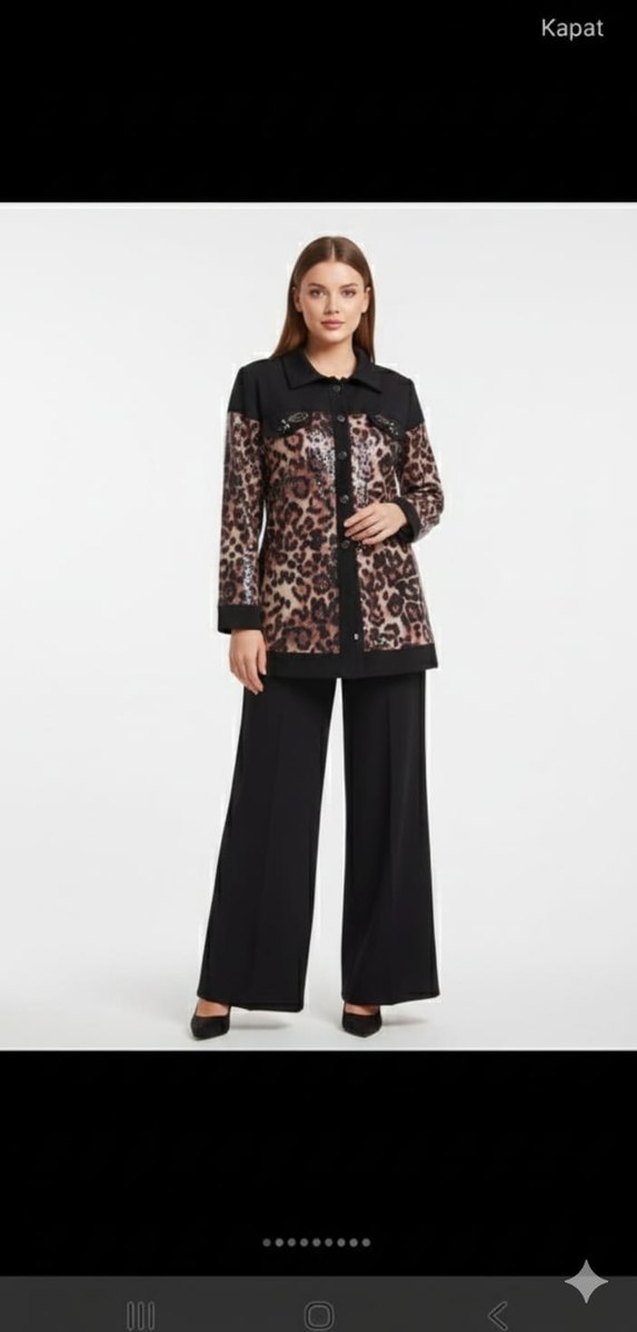 Ürün "HOCAOĞLU" ürünüdür uzun kolu kemerli kahverengi leopar desenli sentetik Kumaş takım pantolon beli lastikli Bol kesim İspanyol paçaxır bir kez giyil di çanta hediye