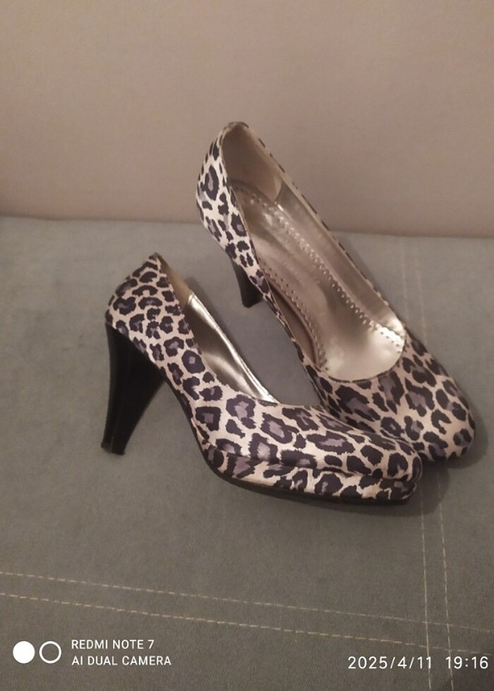 Leoparlı topuklu 37 numara az kullanılmış siyah gri bej renklerde mevcuttur