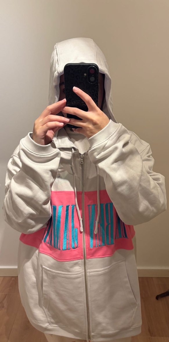 Yumuşak fleece kumaştan, uzun kollu ve yüksek yakalı, fermuarlı sweatshirt. Pastel pembe renkte, baskılı detaylara sahip, rahat kesim ve günlük kullanıma uygun. Hiç giyilmedi etiketi üstünde. Kusuru yok.