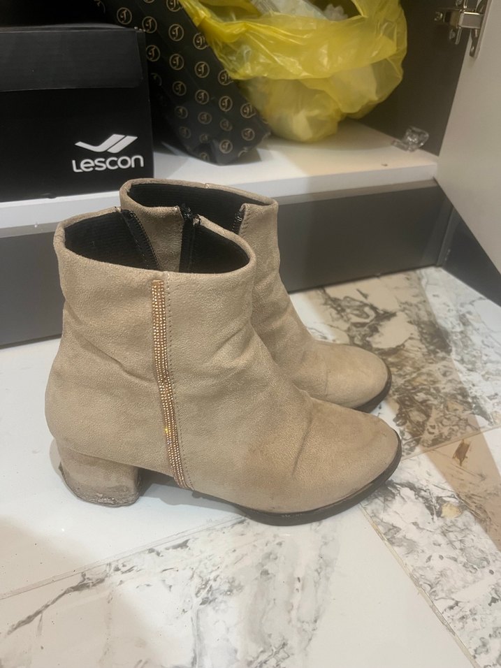 Lescon markalı bej süet, blok topuklu kadın botlar, kürk detaylı ve yan fermuarlı, günlük kullanıma uygun rahat bir tasarıma sahiptir.
