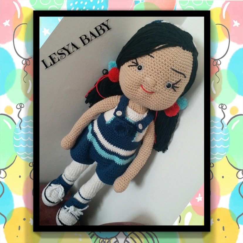 LESYA BABY çok renkli örgü bebek, koyu saçlı, çizgili kıyafet ve spor ayakkabılı. Yumuşak ve detaylı el yapımı tasarım.