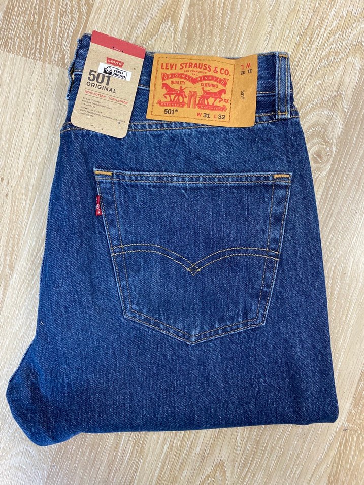 Levi's 501 orijinal mavi denim jean, regular fit ve düğmeli ön kapama ile. Günlük sokak stili için parlak mavi renkte, baskılı detaylara sahip rahat jean. W31132, 501* kodları bulunur.