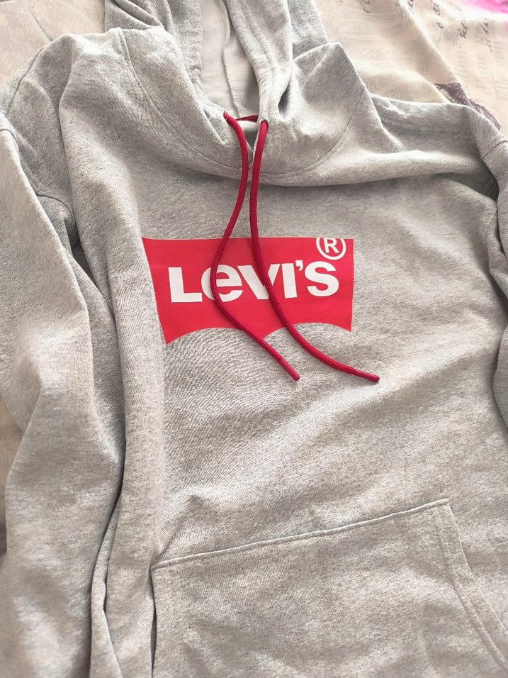Levi's gri kapüşonlu erkek sweatshirt, uzun kollu ve bol kesimdir. Yumuşak, sıcak kumaştan yapılmış, baskılı logo ve kırmızı iplik detaylıdır. Cırt cırt özelliği bulunur.