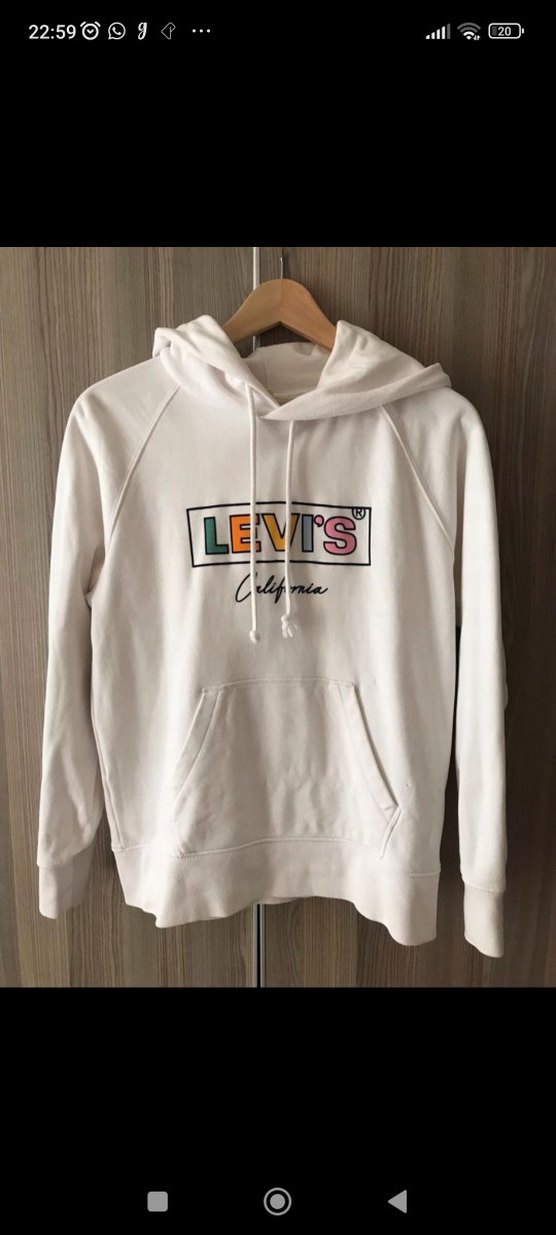 Levi's beyaz pamuklu kapüşonlu sweatshirt, uzun kollu ve bol kesim. Renkli baskılı logo ve ön cep içerir. Günlük kullanım için rahat.