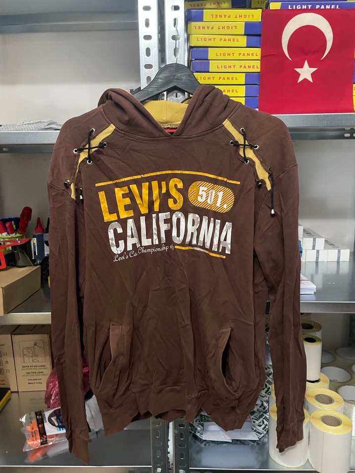Levi's markalı, kahverengi süet kumaştan, uzun kollu ve bisiklet yaka, bol kesim sweatshirt. Üzerinde California baskısı ve fermuarlı detaylar bulunur. Günlük rahat kullanım için uygundur.