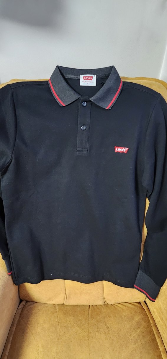 Levi's markalı, kırmızı detaylı, düğmeli yakalı, siyah uzun kollu, vücuda oturan polo tişört. Yumuşak ve sıcak kumaştan üretilmiştir.