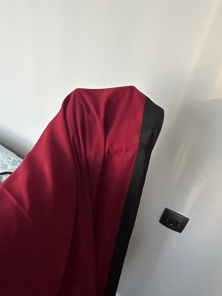 Koyu bordo renkte, saten dokulu ve drapeli tasarıma sahip kadın şalı. Çağdaş ve minimalist tarzı cesurca yansıtıyor.