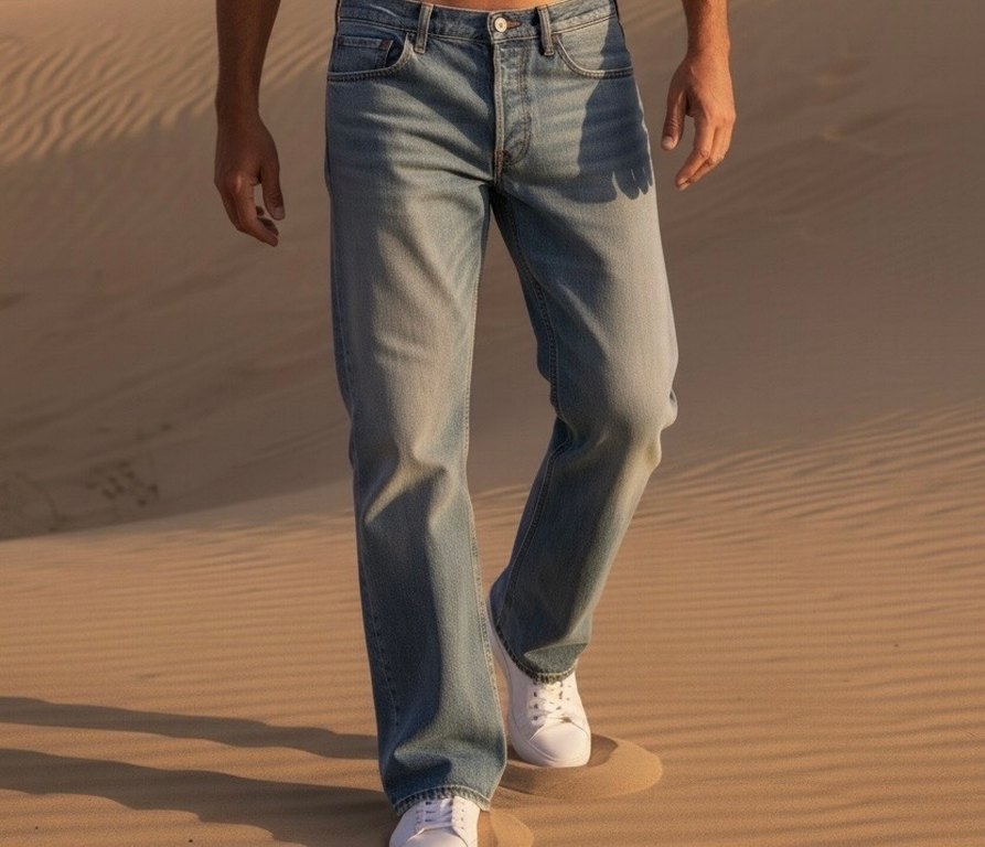 Gri renkte, düğmeli ve regular fit kesime sahip erkek denim pantolon. Normal boyda ve günlük kullanıma uygun rahat bir model.
